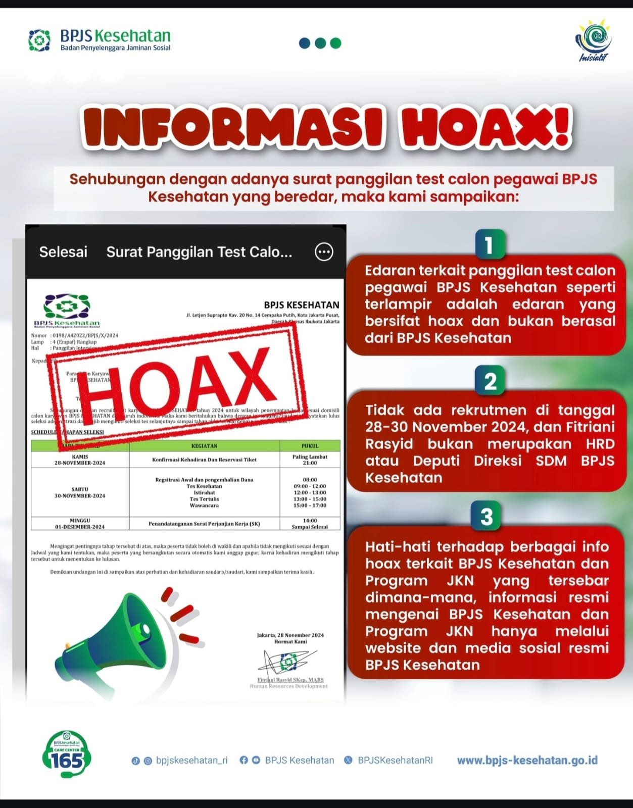 Ia menambahkan bahwa segala informasi resmi terkait BPJS Kesehatan dan Program JKN hanya melalui website dan media sosial resmi dari BPJS Kesehatan. Adapun untuk informasi terkait rekrutmen dapat mengakses pada halaman resmi di https://rekrutmen.bpjs-kesehatan.go.id/karir/.