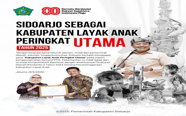 Sidoarjo Raih Penghargaan KLA Peringkat Utama Tahun 2025. Keberhasilan Sidoarjo meraih Peringkat Utama menunjukkan komitmen kuat Pemkab Sidoarjo dalam mewujudkan sistem pembangunan berbasis hak anak.