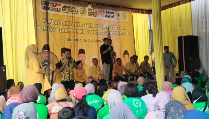 DPD Partai Golkar Kabupaten Sidoarjo menggelar kegiatan pembagian sembako gratis di halaman kantor DPD Golkar Sidoarjo, Minggu (26/10/2025). Kegiatan ini digelar dalam rangka memperingati hari ulang tahun ke-61 Partai Golkar.
