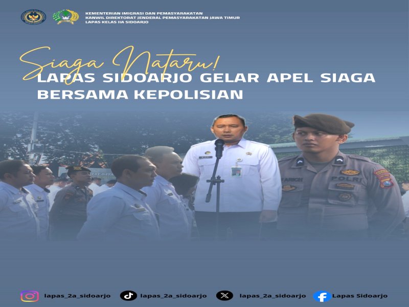 Lapas Sidoarjo laksanakan apel siaga Nataru bersama Kepolisian. Melalui kegiatan ini, Lapas Kelas IIA Sidoarjo menegaskan komitmennya dalam mendukung pengamanan perayaan Natal dan Tahun Baru yang aman, tertib, dan kondusif sebagai bagian dari pelayanan publik yang profesional dan berintegritas.