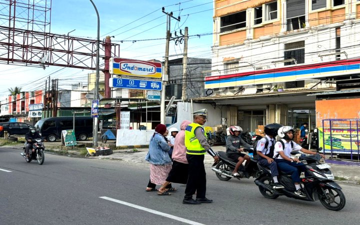 Ditlantas Polda Sulbar beri pelayanan di tengah masyarakat. Tak hanya fokus pada kendaraan, dia juga dengan sigap membantu para pejalan kaki yang ingin menyebrang jalan dengan aman, memastikan tidak ada kesenjangan dalam pelayanan kepada semua pengguna jalan.