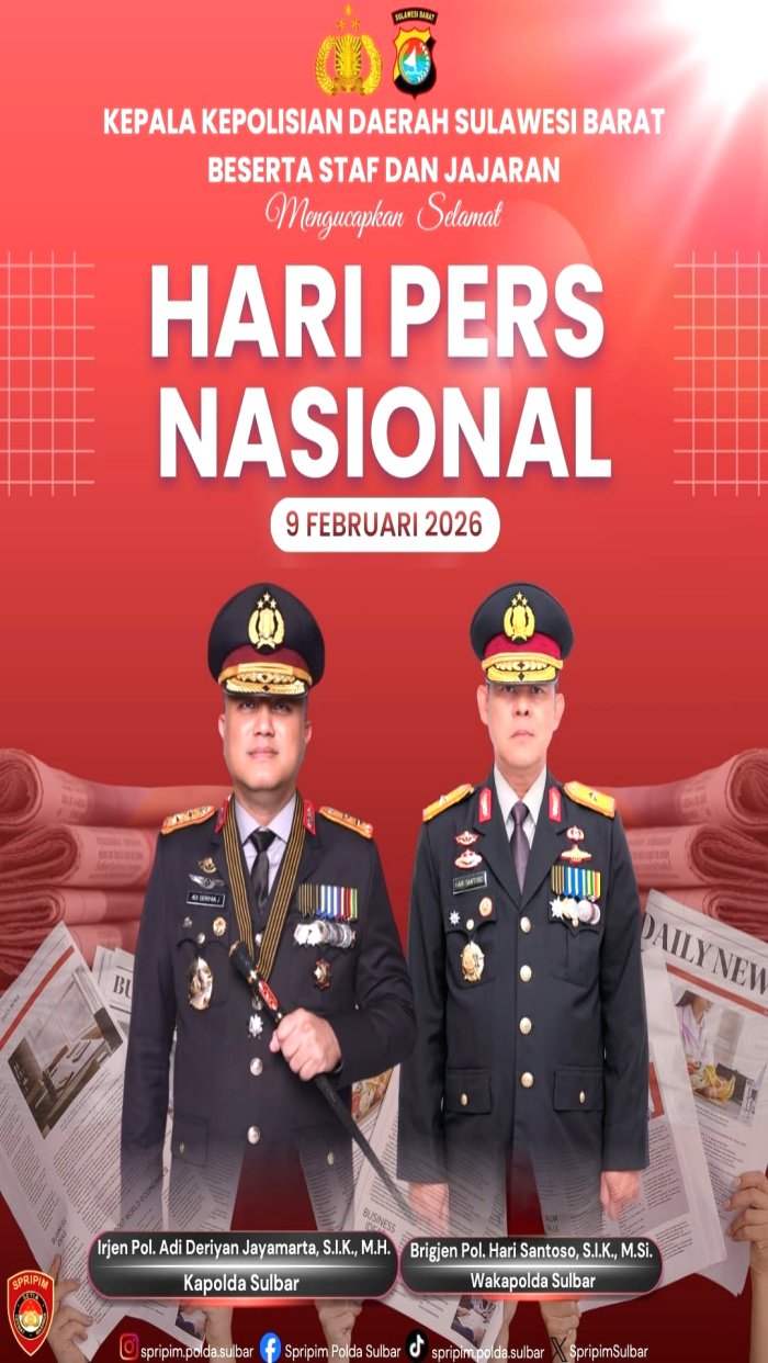 Sulbar, Arjunanusantaranewscom, – Kapolda Sulbar dukung Insan Pers , ucapkan selamat di HPN 2026. Dalam rangka memperingati Hari Pers Nasional yang memasuki usia ke-80 dengan tema “Pers sehat, ekonomi berdaulat, bangsa kuat”, Kapolda Sulawesi Barat Irjen Pol Adi Deriyan Jayamarta mewakili seluruh personel dan jajarannya mengucapkan selamat kepada seluruh insan pers dan lembaga media di seluruh Indonesia, khususnya di Sulawesi Barat.