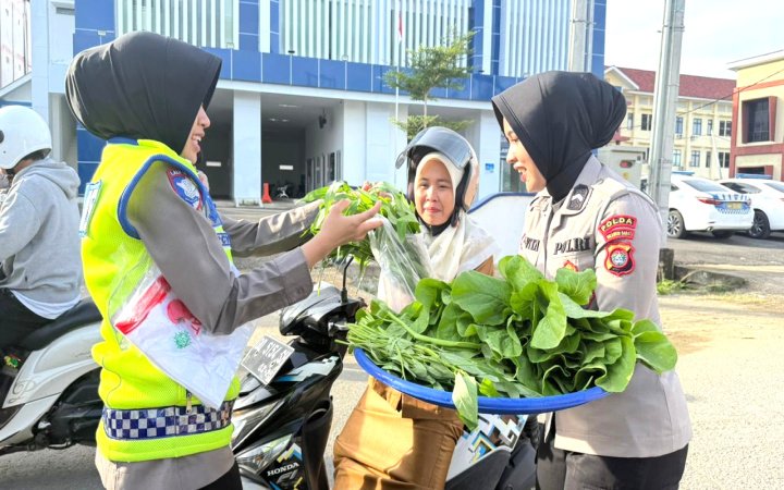 Sebanyak 100 paket sayur-mayur segar hasil panen langsung dibagikan secara gratis kepada para pengendara yang menunjukkan ketertiban dalam berlalu lintas, sebagai bentuk apresiasi sekaligus upaya menjaga semangat tertib berkendara.